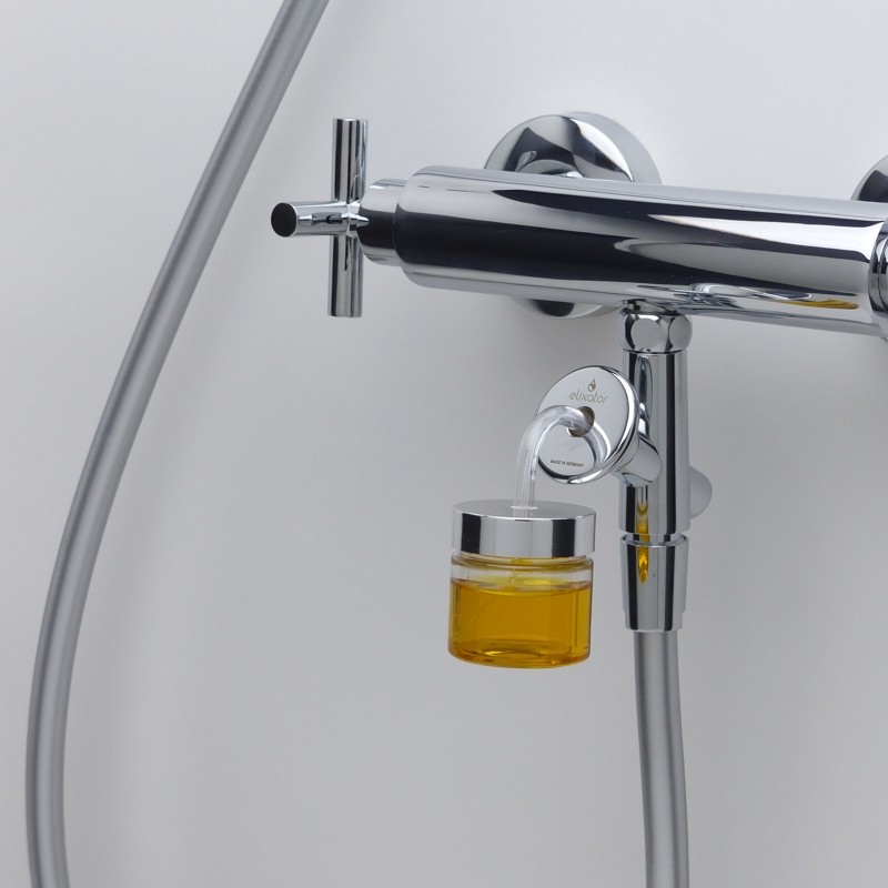System prysznicowy Elixator do tworzenia luksusowego, odżywczego mleczka pod prysznic z czystych, organicznych olejków pielęgnacyjnych. Wystarczy podłączyć do dowolnej baterii prysznicowej.